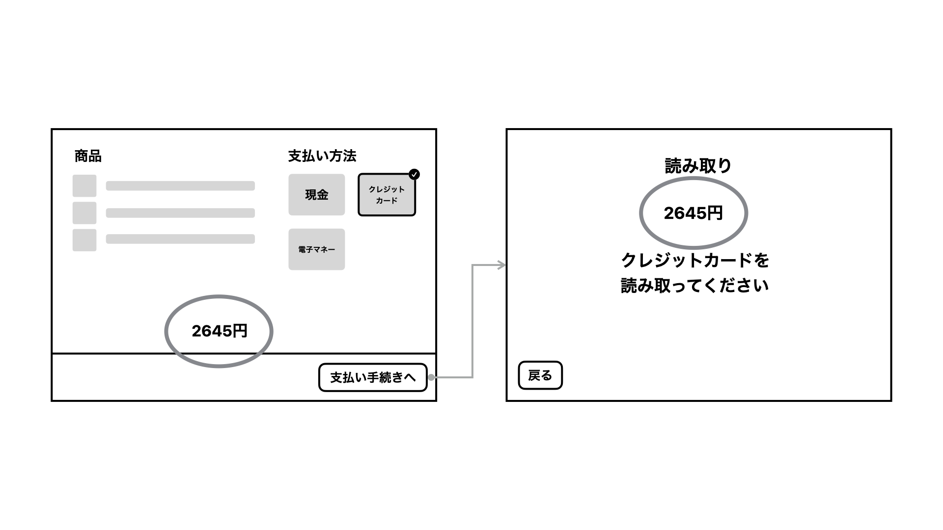 4つの画面のスケッチ。支払い方法の選択画面、商品のスキャン画面、読み取り画面、確認画面が並んでいる。支払い方法の選択では現金、クレジットカード、電子マネーが選択できる。クレジットカードを選択後は商品のスキャン画面へ、商品一覧と合計金額が表示され、「支払い」ボタンが下部にある。支払いを押すと読み取り状態になる。読み取ると確認画面になる。